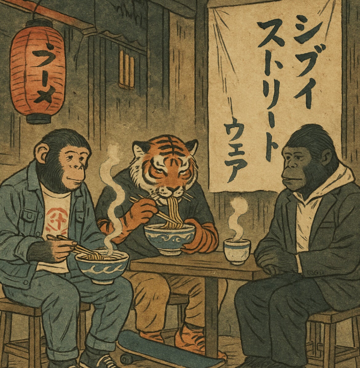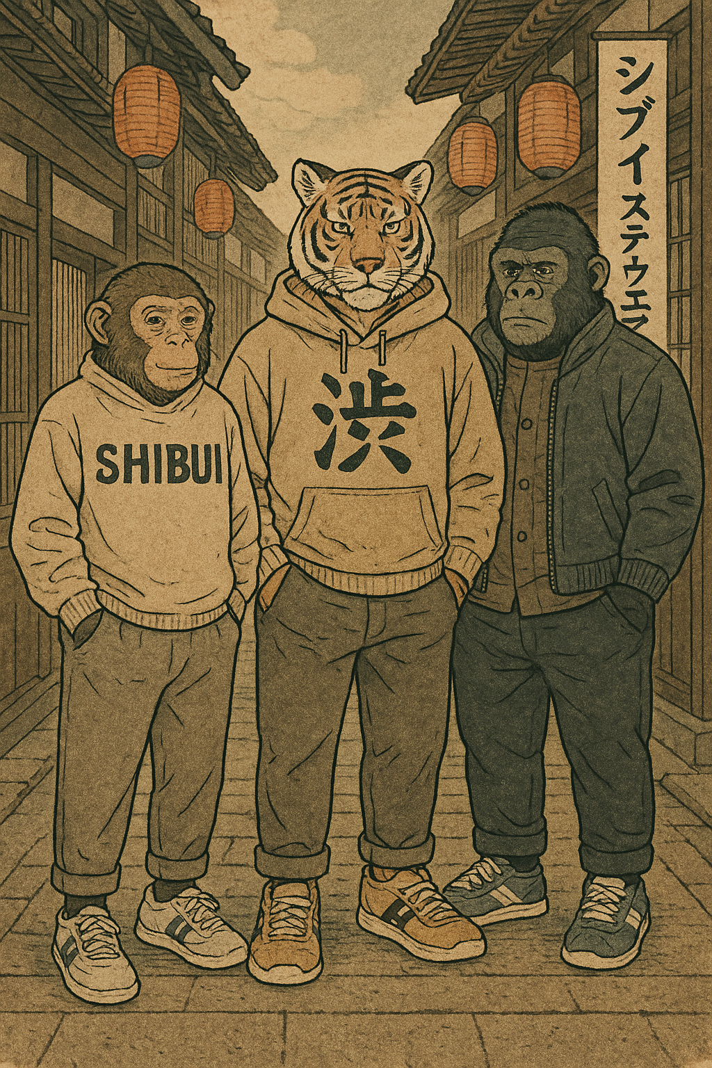 De hoofdfiguren achter Shibui Streetwear zijn Tijger, Gorilla en Aap. Zij zijn gekleed in streetwear in een vintage illustratie.